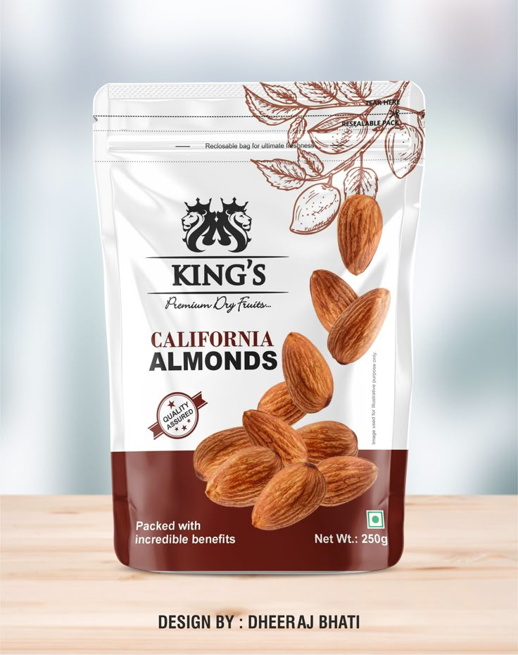 “KING’S California Almonds are premium quality dry fruits packed with incredible health benefits. Resealable pack for ultimate freshness. Quality assured for a nutritious snack every day. Net Weight: 250gm.”
