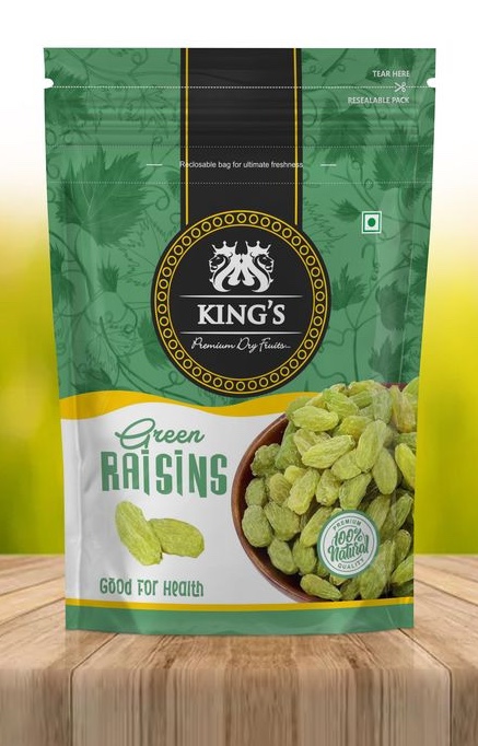“King’s Premium Dry Fruits Green Raisins – 100% natural and good for health. Packed with natural sweetness and nutrients, perfect for snacking or adding to desserts. Comes in a resealable pack for ultimate freshness.”