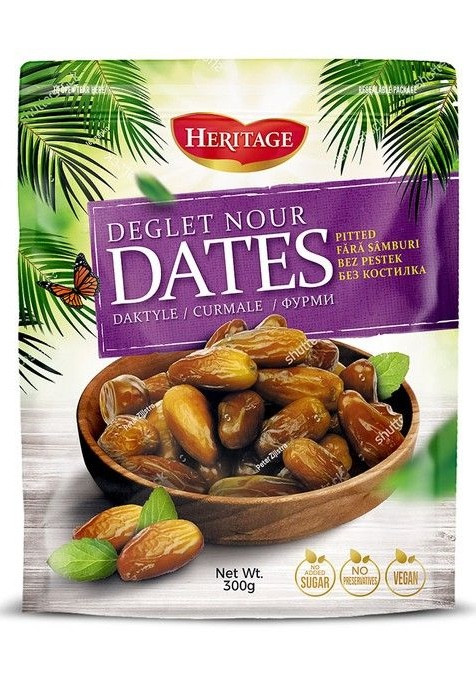 “Heritage Deglet Nour Dates – Naturally sweet, pitted dates with no added sugar and no preservatives. Vegan-friendly and perfect for a healthy lifestyle.”